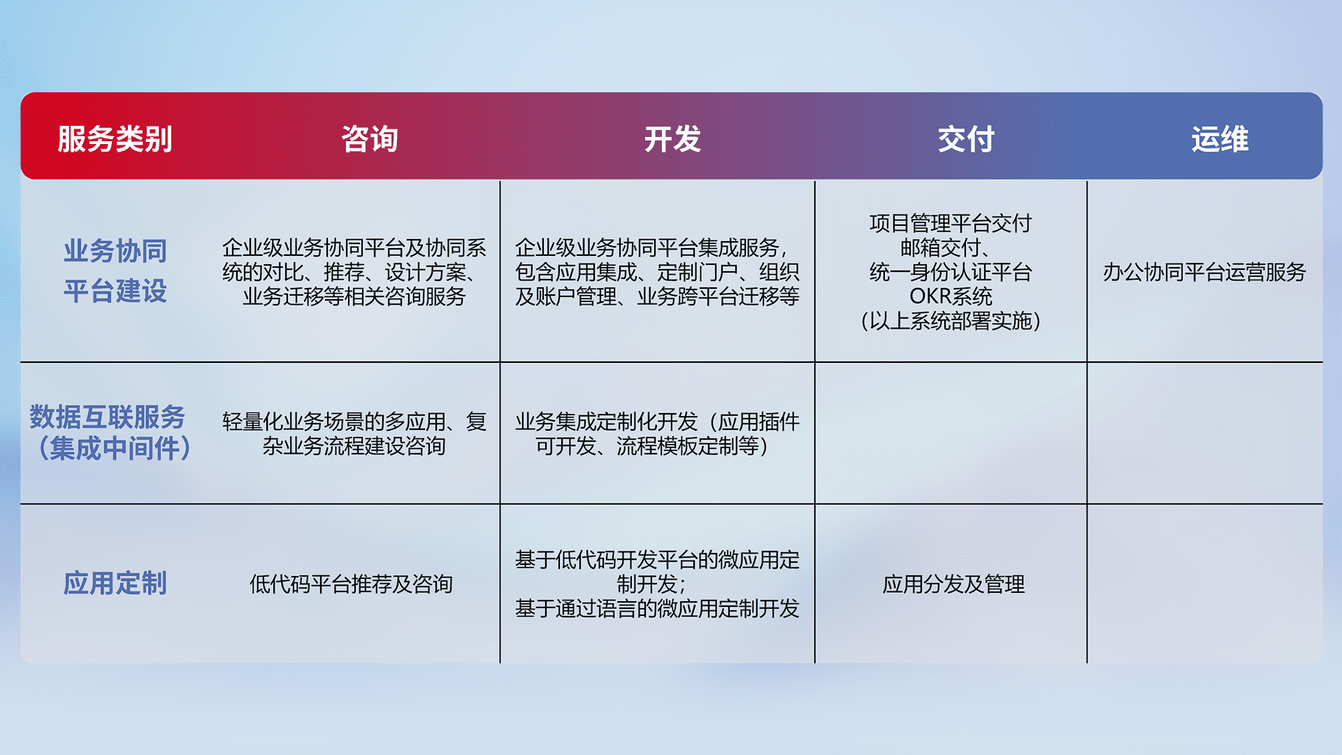 针对钉钉、、、企微、、IDaas等平台级产品提供产品的规划、、、、方案、、交付、、定制化开发等服务,,实现如统一协同办公、、智能客户服务、、混合会议管理、、智能数据查询、、、等业务场景,,,实现数字化转型。。。