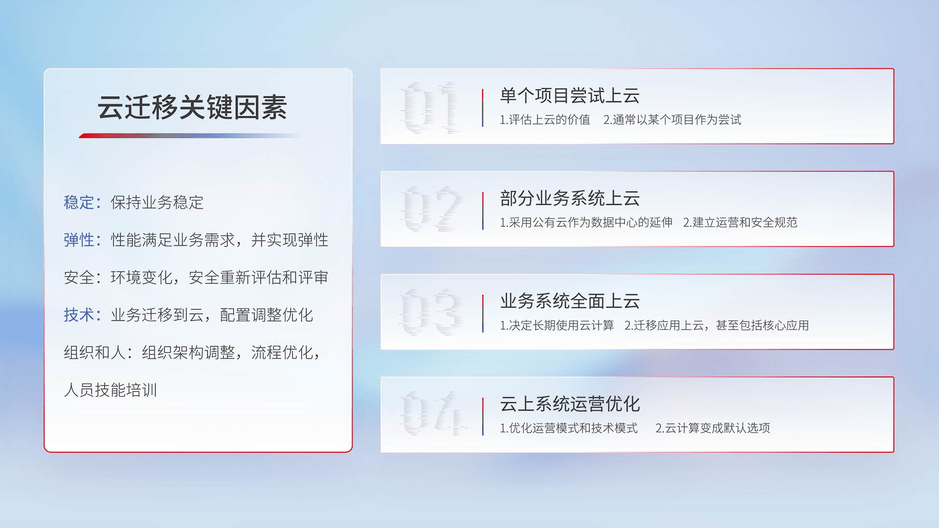 结合实际业务,,,从规划设计、、、云平台选型、、云原生改造、、、、数据迁移、、、、集成交付,,迁移全过程为客户识别最佳上云路径,,,,做好风险识别管理,,设计网络架构、、、、身份权限、、、、安全审计合规、、操作审计、、、、日志审计、、监控告警策略、、、多站点容灾设计等,,对云上基础设施进行整体规划,,,提升IT治理水平,,,,以满足弹性、、高可用、、高性能的需求。。。。